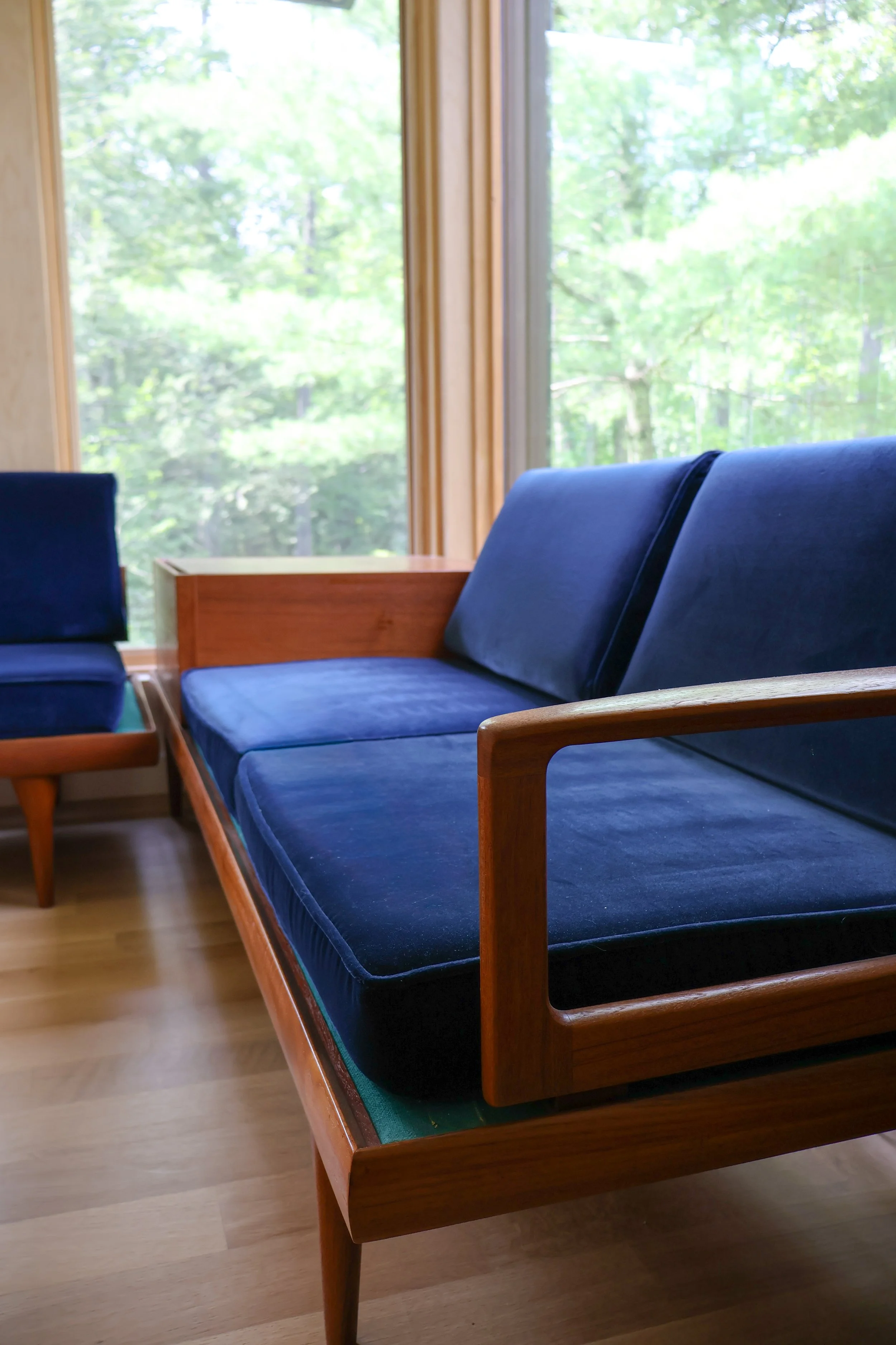 very rare vintage modular sectional set with side tables and coffee tables (teak & blue velvet) by Hans Olsen for Bramin